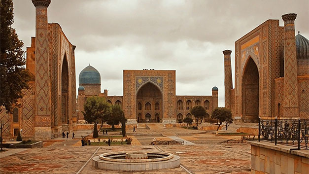 Sightseeing tour in Samarkand: Excursion to medieval architectural monuments – Guri Emir mausoleum – the burial place of Tamerlane, “Stars above Samarkand” – Registan square with Ulugbek (15c), Shir Dor (17c), Tillya-Kari Madrassahs (17c), Bibi Khanum Mosque and Bibi Khanum’s Mausoleum.